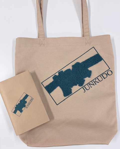 このジュンク堂の…みどりのモジャモジャマークがふわふわなんですよ…。さわってて気持ちいいです。一緒に写ってる本は漫画サイズですので、バックも結構大きめです。内側にマグネットがついているので、フタをできる感じですね~。