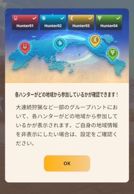 グループハントの時に、それぞれのハンターがどこの地域から参加しているかがわかるようになりました…。たまに、アメリカとかヨーロッパから参加していることもあったりと、面白いですね~。