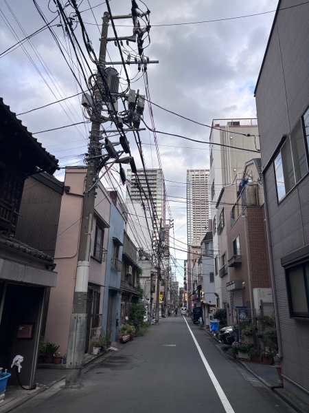 月島は、細い路地が多いですよね~。夜に来るのもいいですが…昼間もいいですね。猫がとおったりしますよ…。住んでる方々の迷惑にならないようにしなければいけませんね~。